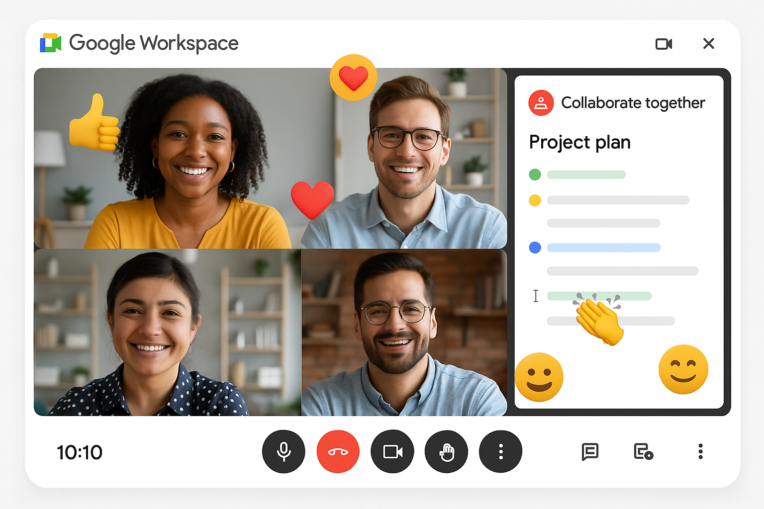 Experience seamless virtual teamwork with the Google Workspace Meet interface, showcasing real-time collaboration, floating emoji reactions, and shared document editing. The intuitive design encourages engagement, making remote meetings more dynamic, expressive, and productive.